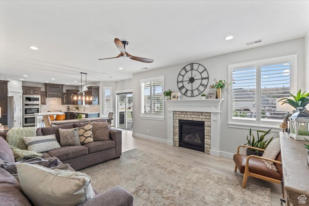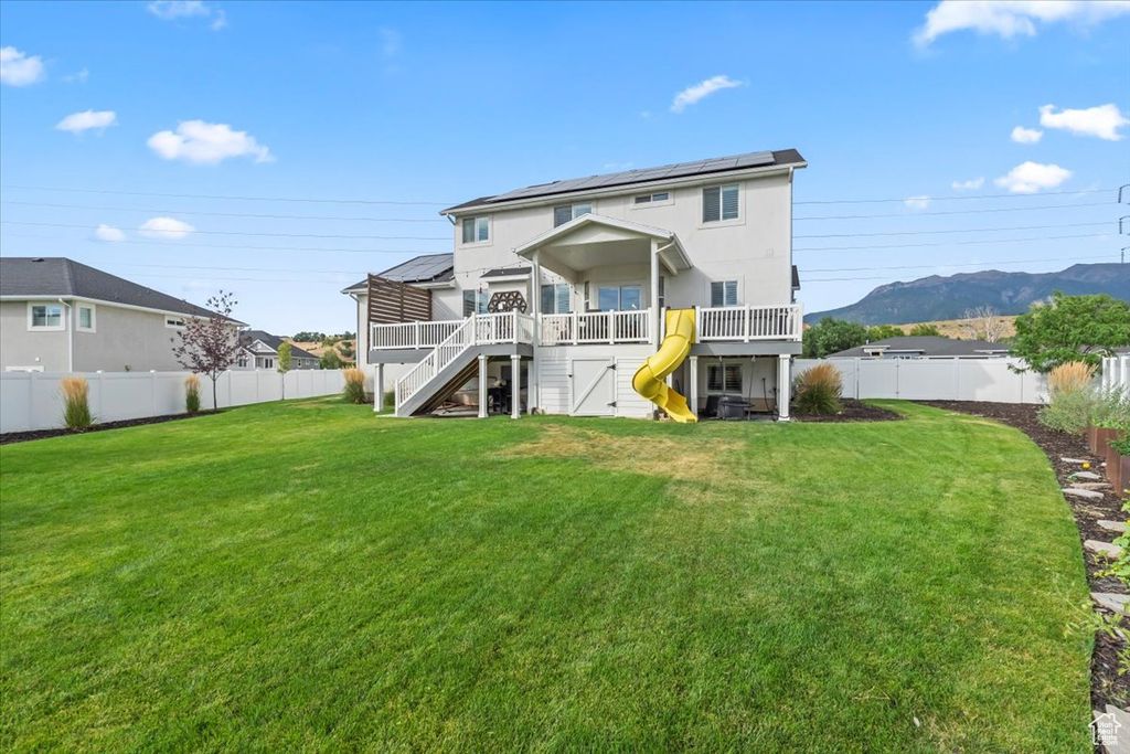 Nestled in South Weber, this clean and spacious home offers 6 bedrooms and 3.5 bathrooms with thoughtful upgrades throughout. The main living area features a shiplap accent wall, custom shutters on every window, and a bright, open kitchen with quartz countertops, double ovens, and plenty of space to entertain. A stylish office with a modern decorative wall provides the perfect work-from-home setup. The laundry room is designed with convenience in mind, featuring built-in laundry baskets and a countertop. The oversized garage is a true standout-painted, heated, with epoxy floors, a mezzanine for storage, and space for up to 4 vehicles. Step outside to a backyard built for gatherings. A large deck spans the entire back of the home, complete with a hot tub, plenty of room for dining, and space to host friends and family. Lastly, home is equipped with a 12.4 kW solar system, providing energy efficiency and long-term savings. With its beautiful yard and mountain setting, this South Weber gem blends comfort, function, and style.