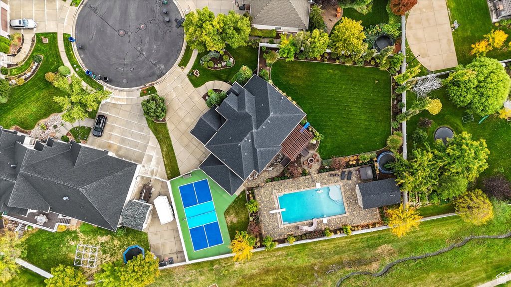Welcome to this stunning home in the highly sought-after Mountain Vistas neighborhood. Perfectly tucked away in a private cul-de-sac, it offers breathtaking views of the Wasatch Mountains. The backyard is truly the crown jewel of this property, fully renovated within the past four years to create a resort-like retreat. The custom pool, gunite with the look of a pebble bottom that is not rough like a typical pebble bottom, evokes the feeling of a luxury getaway and is safely enclosed by a low wrought-iron fence that seamlessly blends each gathering space. The pool is 42' by 20' and 9' deep. Has an auto chemical feature that is highly desired. Adding to the outdoor appeal is a detached pool washroom, ensuring convenience while keeping your home dry, along with a pickleball court, fire pit, and expansive open lawn, ideal for both relaxation and entertainment. Step inside, and you'll be greeted by timeless charm highlighted by beautifully crafted custom wood columns. Plenty of bedrooms for the whole family. Open concept living space with a large laundry/mudroom as well as a formal dinning room and separate private den. The basement is newly finished within the last 5 years. It includes large open spaces for plenty of gaming tables and includes a wet bar, perfect for entertaining during the holiday seasons.