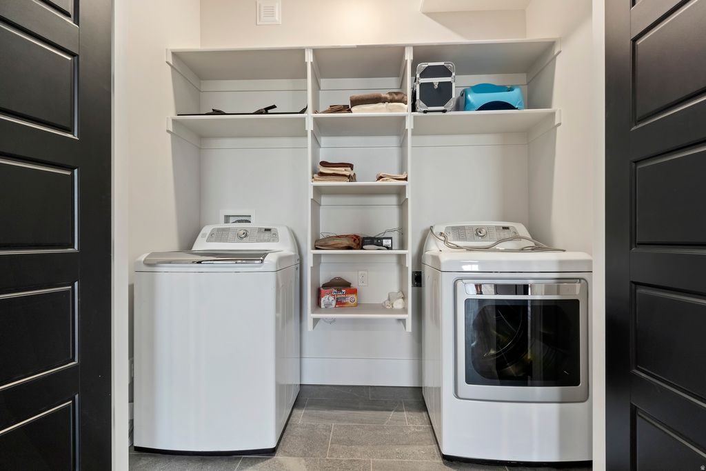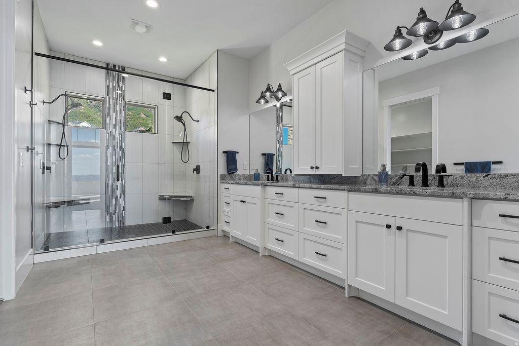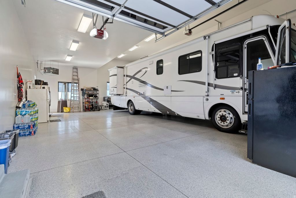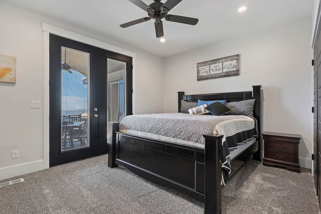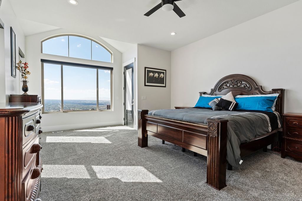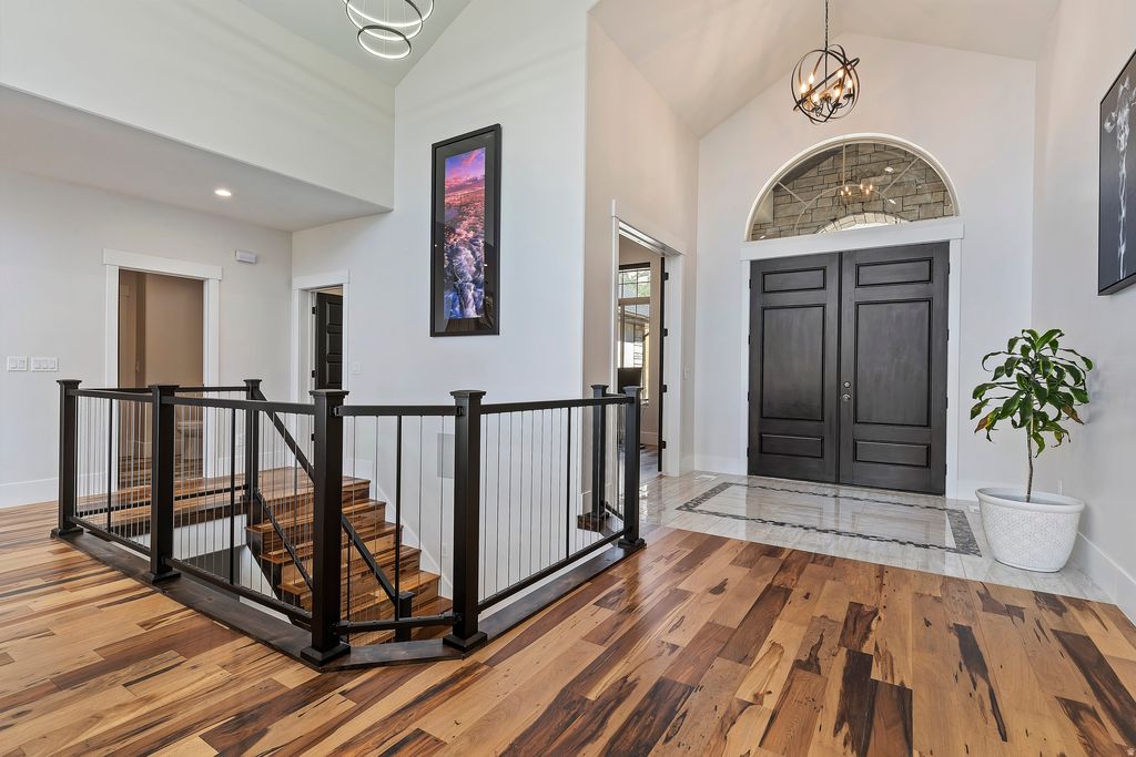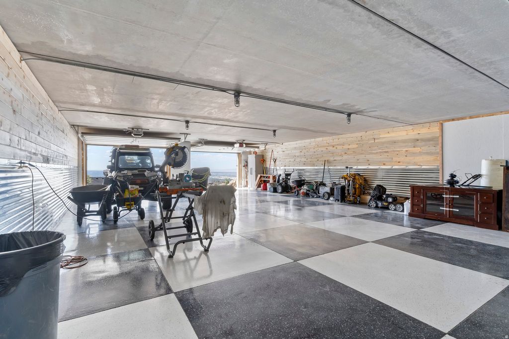 Experience unparalleled luxury in this immaculate, custom-built mountainside retreat, poised high above North Ogden with breathtaking, never-ending valley views. This bright, open floor plan features soaring vaulted ceilings and an expansive great room anchored by a gas fireplace. The chef's kitchen is a masterpiece, boasting custom cabinetry, granite countertops, and a commercial-grade Thor range/oven and hood vent. The opulent primary suite offers private deck access, a massive ensuite with heated floors, a dual-head shower, and a custom walk-in closet. Enjoy smart living with motorized shades, a whole-house speaker system, and dual-level laundry. The fully finished walkout basement is an entertainer's dream, featuring a huge family room, exercise space, cold storage, and plumbing for a second full kitchen. Car enthusiasts and hobbyists will revel in the finished, heated triple-bay garages (220v ready), including a massive 14'x12' RV garage and a unique suspended garage with epoxy floors. Upgraded insulation, dual HVAC, and a tankless water heater ensure year-round comfort. Surrounded by custom landscaping, an integrated pond, and auto lighting, this exclusive home is located on a private drive, offering the ultimate blend of seclusion and sophistication. The garage is large and has a suspended floor, providing extra storage or future living space underneath the main garage. This room underneath the suspended garage is included in the basement square footage. Sq. footage per tax data records. All property facts are provided as a courtesy; Buyer to verify all information.