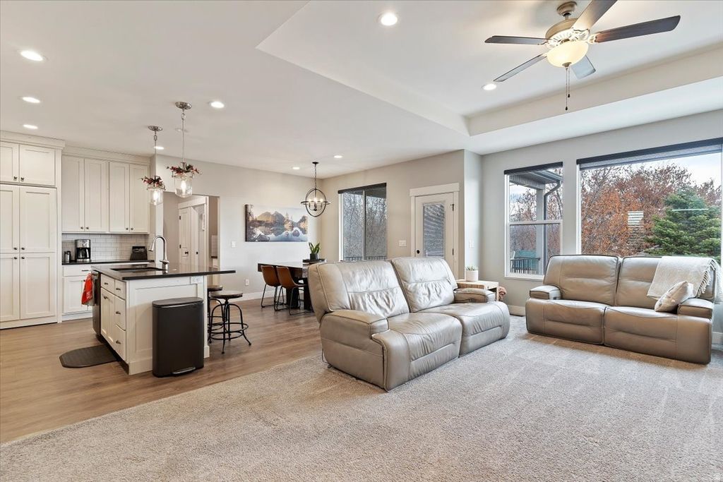 Stunning former model rambler on spacious .43-acre cul-de-sac lot with no HOA and exceptional upgrades throughout. Enjoy laminate floors, floor-to-ceiling cabinets, quartz countertops, slate stainless appliances, gas range, soft-close cabinetry, automatic blinds, a Murphy door to the large pantry, and 9' ceilings with a 10' tray ceiling. The spacious great room features a gas fireplace with a shiplap wall and big windows that fill the home with natural light. The primary suite offers a luxurious retreat with double vanity, quartz tops, deep soaker tub, separate shower with quartz surround, and a walk-in closet. Main-level conveniences include laundry, a mudroom with media drop zone, and a huge dining area. The daylight basement (possible ADU or mother in law apartment) provides a second kitchen, walkout access, cold storage, basement pantry, and additional living flexibility. Exterior highlights include a 4-car garage with massive storage loft, Tesla charger negotiable, big RV pad, tons of parking, covered Trex deck, large cement back patio, in-ground trampoline, swing-set area, putting green, garden beds, and a beautifully maintained backyard.
