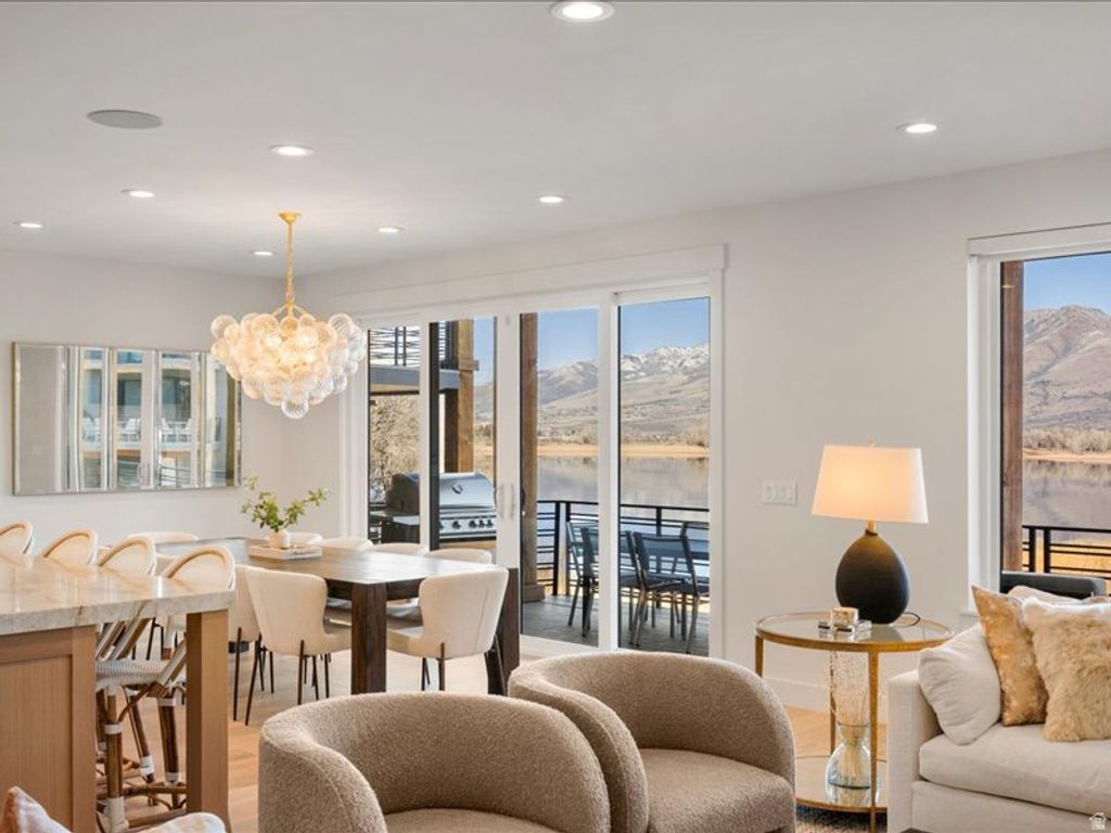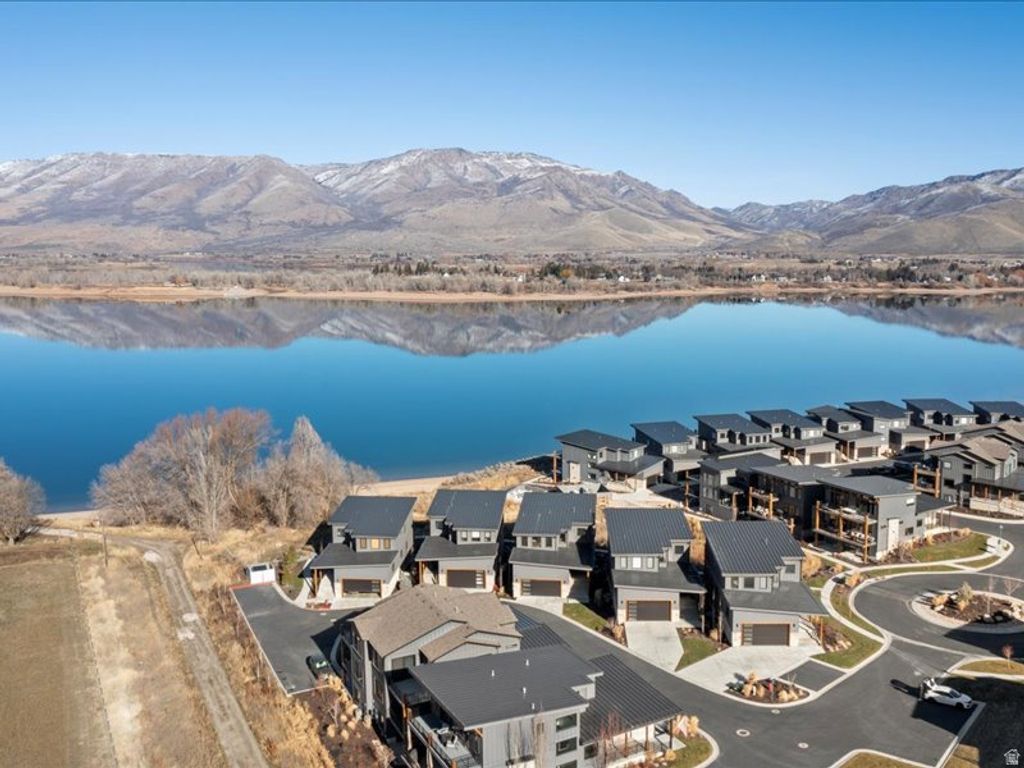 This lakefront home in The Escapes at Edgewater offers rare direct water views over Pineview Reservoir with the added benefit of short term rental zoning, blending lifestyle appeal with strong income potential. Featuring hardwood floors throughout, a chef focused kitchen with upgraded appliances including a premium range and built in refrigerator, quartzite countertops, and a prep sink ideal for entertaining. The primary suite is finished with marble countertops. The secondary baths and powder room features quartz for a cohesive look. Ensuite bathrooms for all upper level suites and a jack and jill bathroom for the lower level. Upgraded cabinetry adds storage and polish throughout the home. An integrated sound system serves the main level, basement media room, and outdoor deck. Enhanced floor and wall insulation improves year round comfort and sound management. It includes custom drapery in select upstairs bedrooms and the landing pairs with motorized shades throughout. Cozy up to two stone fireplaces anchoring the living spaces. With a closed in loft providing a dedicated office area. Enjoy the oversized sliding doors off the dining area, designed to maximize lake views. Practical upgrades include a water softener, roof heat cable, epoxy coated garage floors, dual tankless water heaters, and electrical in place on the lower patio for a future hot tub. All located just 8 minutes to world class skiing at Snowbasin Ski Resort, home to the 2034 Winter Olympics, and 25 minutes to Powder Mountain Ski Resort. Square footage figures are provided as a courtesy estimate only and were obtained from floor plans. Buyer is advised to obtain an independent measurement.