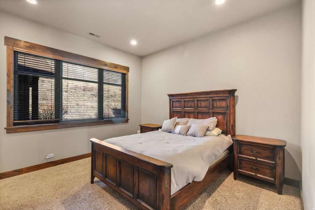 Designed by Bertoldi Architects and built by Big Canyon Builders, this fully furnished, turn-key mountain-modern retreat is perched atop the Highlands development in the heart of a ski mecca, offering elevated views of Pineview Reservoir, Snowbasin peaks, and Nordic Valley ski area. Open space to the front and side enhances privacy, while horses graze in warmer months and deer wander in winter, creating a serene alpine lifestyle. The main level blends elegance and function with travertine tile and Brazilian hardwood floors. A gourmet kitchen features marble countertops, Wolf six-burner range, alder cabinetry, Sub-Zero appliances, dual dishwashers, and a raised island for entertaining. The living and dining areas offer coffered ceilings, stone fireplace, expansive windows, and deck access, all with panoramic mountain and reservoir views. The primary suite is a private sanctuary with fireplace, deck, spa-inspired bath, and walk-in closet, while a second main-level bedroom provides ensuite comfort. The lower level is perfect for relaxation and entertaining, featuring a glassed-in wine room, stone fireplace, wet bar with Sub-Zero mini refrigerator, walk-out access to a Bullfrog hot tub, and a theater/media room. Three additional ensuite bedrooms with walk-in closets and granite finishes complete this luxurious mountain retreat in one of Utah's most coveted ski destinations.