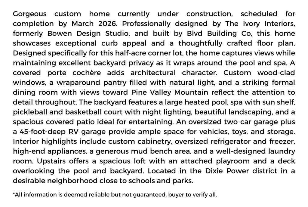 Gorgeous custom home currently under construction, scheduled for completion by March 2026. Professionally designed by The Ivory Interiors, formerly Bowen Design Studio, and built by Blvd Building Co, this home showcases exceptional curb appeal and a thoughtfully crafted floor plan. Designed specifically for this half-acre corner lot, the home captures views while maintaining excellent backyard privacy as it wraps around the pool and spa. A covered porte cochre adds architectural character. Custom wood-clad windows, a wraparound pantry filled with natural light, and a striking formal dining room with views toward Pine Valley Mountain reflect the attention to detail throughout. The backyard features a large heated pool, spa with sun shelf, pickleball and basketball court with night lighting, beautiful landscaping, and a spacious covered patio ideal for entertaining. An oversized two-car garage plus a 45-foot-deep RV garage provide ample space for vehicles, toys, and storage. Interior highlights include custom cabinetry, oversized refrigerator and freezer, high-end appliances, a generous mud bench area, and a well-designed laundry room. Upstairs offers a spacious loft with an attached playroom and a deck overlooking the pool and backyard. Located in the Dixie Power district in a desirable neighborhood close to schools and parks. *All information deemed reliable but not guaranteed, buyer to verify all.