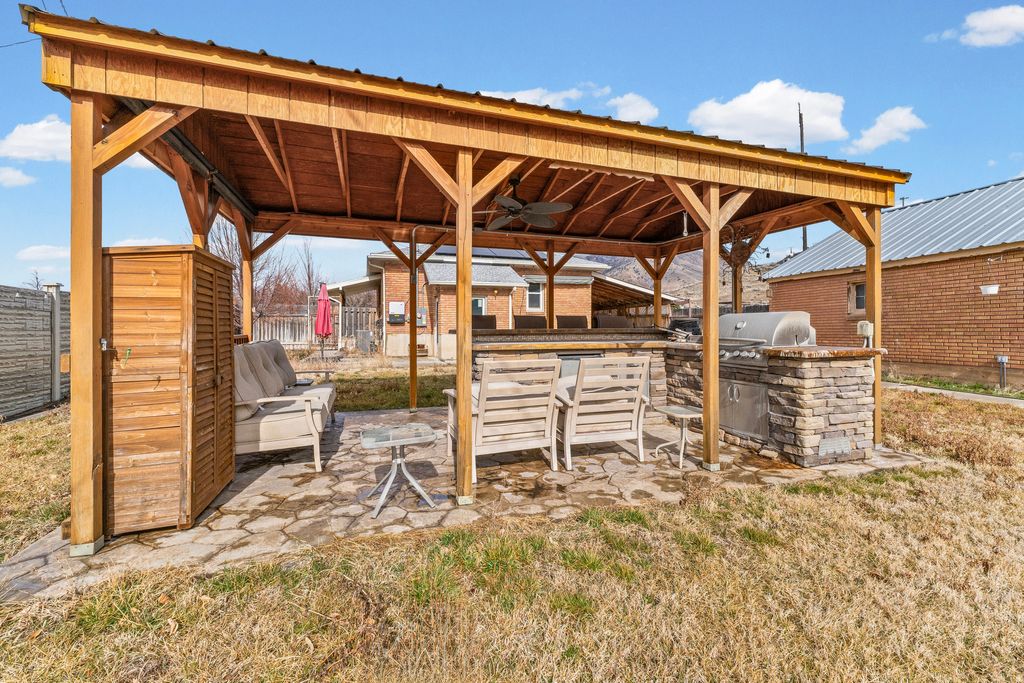 Welcome to this beautifully maintained Brigham City rambler, offering space, functionality, and incredible versatility, all set on an expansive lot with stunning mountain views and room for all your toys, trailers, and outdoor adventures. From the moment you step inside, you're greeted by a bright, open living space filled with natural light from oversized bay windows, creating a warm and inviting atmosphere perfect for everyday living or hosting friends and family. The layout flows effortlessly, making the home feel both comfortable and spacious. One of the true highlights of this home is the kitchen, which was completely gutted and remodeled just four years ago. Thoughtfully designed with both style and function in mind, it features updated finishes, a peninsula with bar seating, a gas range, stainless steel appliances, and a semi-formal dining area, making it the perfect gathering space for meals, conversations, and entertaining. The main level offers a primary suite along with an updated three-quarter bathroom, providing convenient single-level living. Downstairs, the finished basement expands your options with a large family room, a cozy gas fireplace, and an oversized second primary suite complete with modern flooring, a spacious walk-in closet with custom built-ins, and its own three-quarter bathroom, ideal for guests, multi-generational living, or added privacy.Step outside and discover a backyard designed for both relaxation and entertainment. The fully fenced yard features garden boxes, multiple storage sheds, a sprinkler system on secondary water, and a covered patio, creating a space that's as functional as it is enjoyable. The showstopper is the fully equipped covered outdoor kitchen, designed to impress. This space truly elevates outdoor living, featuring its own mini refrigerator, barbecue, expansive two-tier island, ample storage, ceiling fan, and stylish shade coverings with drapes, creating the ultimate setting for hosting gatherings, summer nights, and memorable get-togethers. Whether you're entertaining a crowd or enjoying a quiet evening, this space delivers a unique lifestyle experience that's hard to find. Additional features include fully paid-off solar panels (at closing) for energy efficiency, a heated detached two-car garage with air compressor, abundant parking including large RV parking, whole-home water filtration, water softener, home humidifier, updated copper plumbing, and UTOPIA fiber internet availability. This property offers the rare combination of space, upgrades, and lifestyle, inside and out. A home with this much flexibility and functionality is a must-see.This home offers the space, amenities, and versatility today's buyers are looking for-schedule your private showing today. Buyer and Buyers agent to verify all information. Square footage figures are provided as a courtesy estimate only. Buyer is advised to obtain an independent measurement.