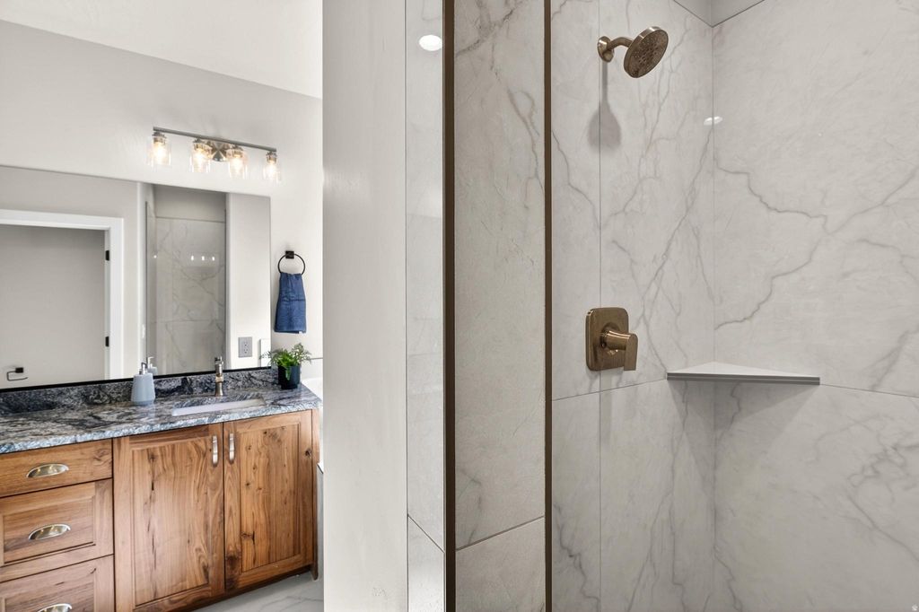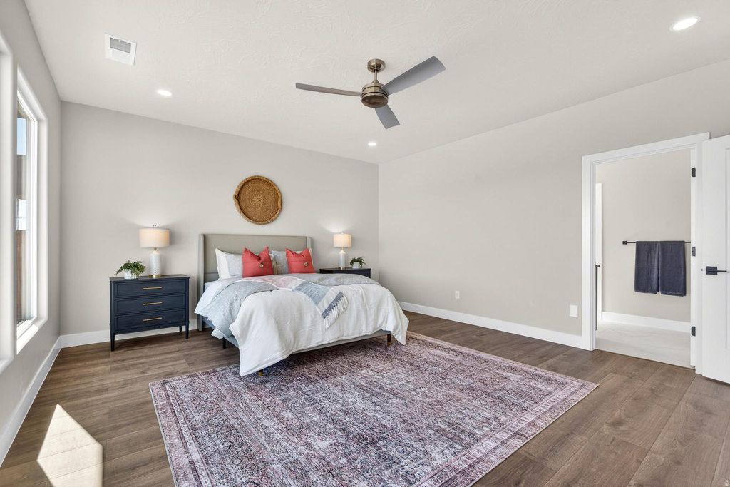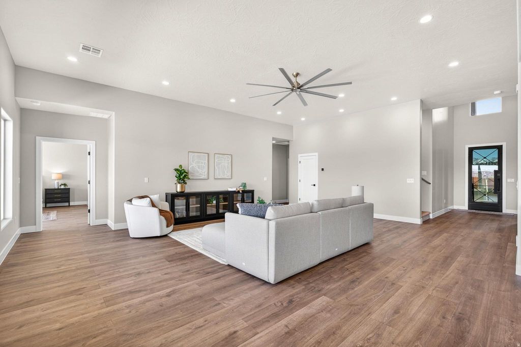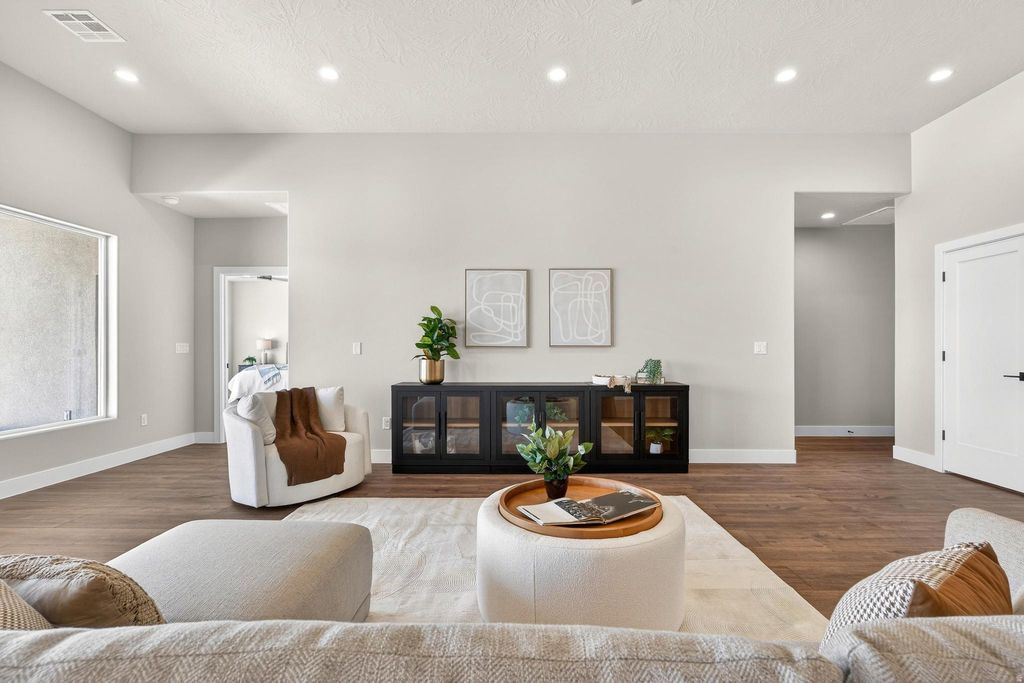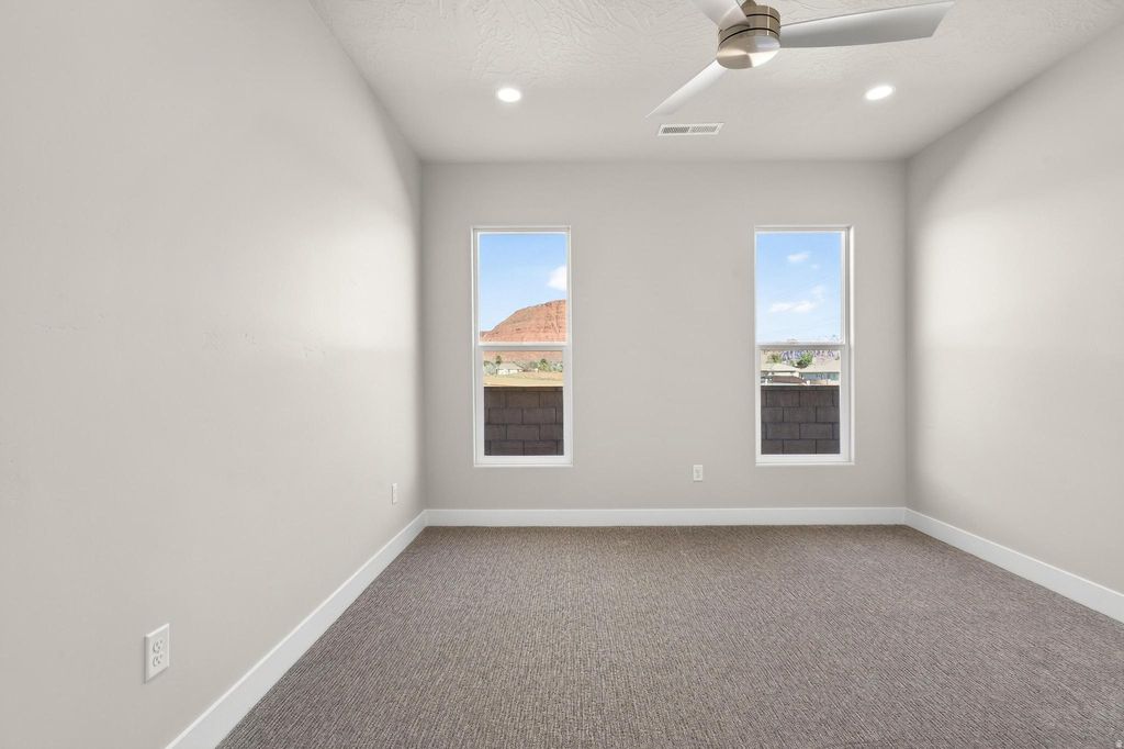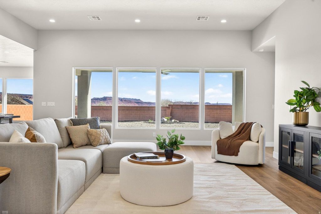 Welcome to Black Stone in beautiful Ivins, breathtaking Red Mountain backdrop. This brand-new home showcases stunning views, thoughtful design, and elevated finishes throughout. An inviting open floor plan is highlighted by luxury wood-plank flooring, both stylish and durable, perfectly suited for Southern Utah living. The kitchen is truly the heart of the home, featuring custom knotty alder cabinetry with rich natural wood grain, soft-close hardware, and detailed craftsmanship. Designer selected granite countertops pair seamlessly with a modern stacked tile backsplash and stainless-steel appliances, creating a warm space ideal for everyday living and entertaining. The spacious living room offers tall ceilings and is plumbed for a future fireplace, providing the perfect setting to gather and relax. A convenient half bath is located just off the main living area for guests. The main level includes two secondary bedrooms with a full bathroom, along with a beautifully appointed primary suite. The primary bath features sleek finishes and a spa-like atmosphere, complete with a 3/8" Euro glass shower enclosure. Upstairs, you'll find a versatile bonus room with its own full bathroom, ideal for a media room, office, gym, or private guest retreat. It is also plumbed for a mini-split system, allowing for customized climate control. Additional highlights include the entire home plumbed for central vacuum, a fully landscaped yard with room for a future pool, and exceptional garage space with a 12' wide x 14' tall RV garage door plus an oversized two-car garage with an 18' wide, 10' tall door. Offering space, quality craftsmanship, and unforgettable Red Mountain views, this home is a rare opportunity in one of Ivins' most desirable communities.