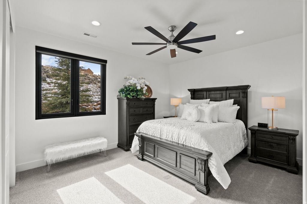 Tucked away in a quiet cul-de-sac in Heber City, this stunning custom home captures breathtaking views of Mt. Timpanogos from nearly every room, blending luxury, privacy, and effortless mountain living. Barely lived in and in absolutely pristine condition, the home showcases high-end upgrades throughout with no expense spared, creating a flawless, model-home feel enhanced by Sonos ceiling speakers in practically every room. Expansive windows flood the space with natural light, while the serene backyard offers a private deck and fire pit surrounded by beautifully designed, low-maintenance landscaping. Enjoy ultimate winter convenience with a heated driveway and heated walkway to the front entry, plus roof heat tape and an EV charger in the garage. The ADU lives like its own private home, complete with a beautiful full kitchen and a stacked washer and dryer thoughtfully tucked into the walk-in closet, making it ideal for guests, multigenerational living, or rental potential. Immaculate and completely turnkey, this home delivers refined mountain living at its finest. the vacant lot next door is also available for a separate purchase.
