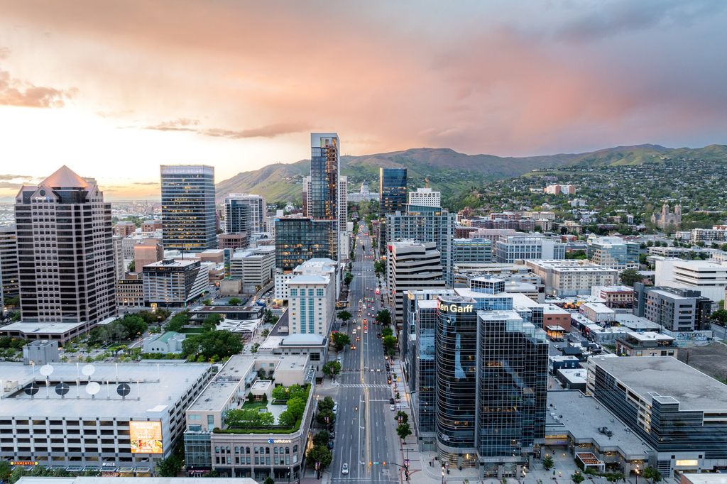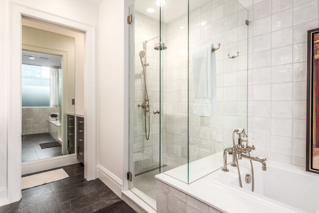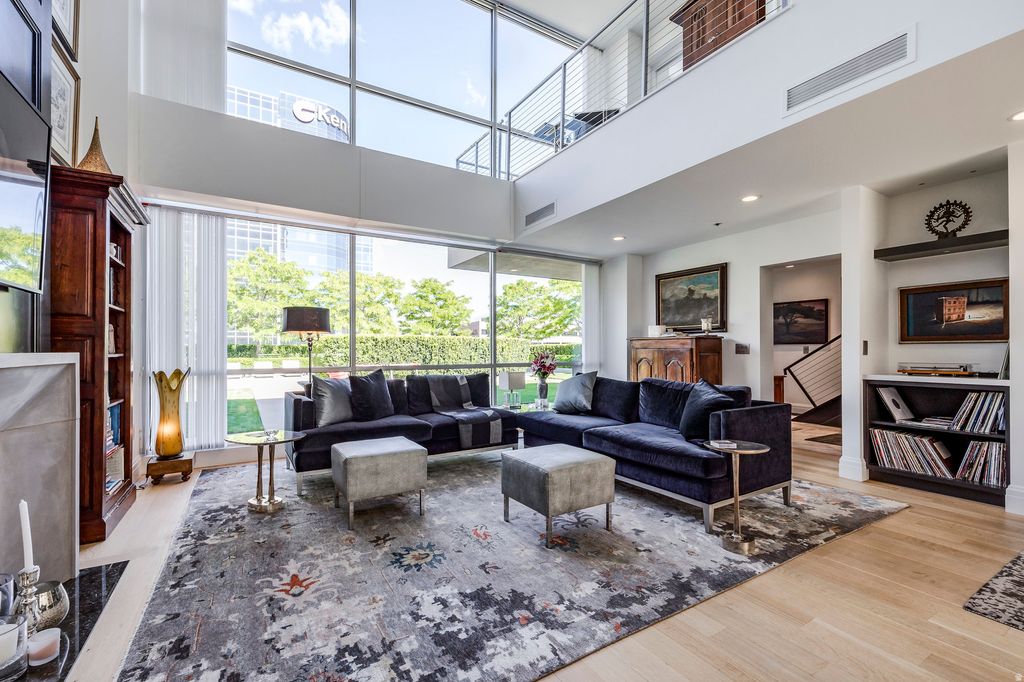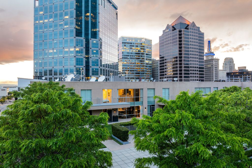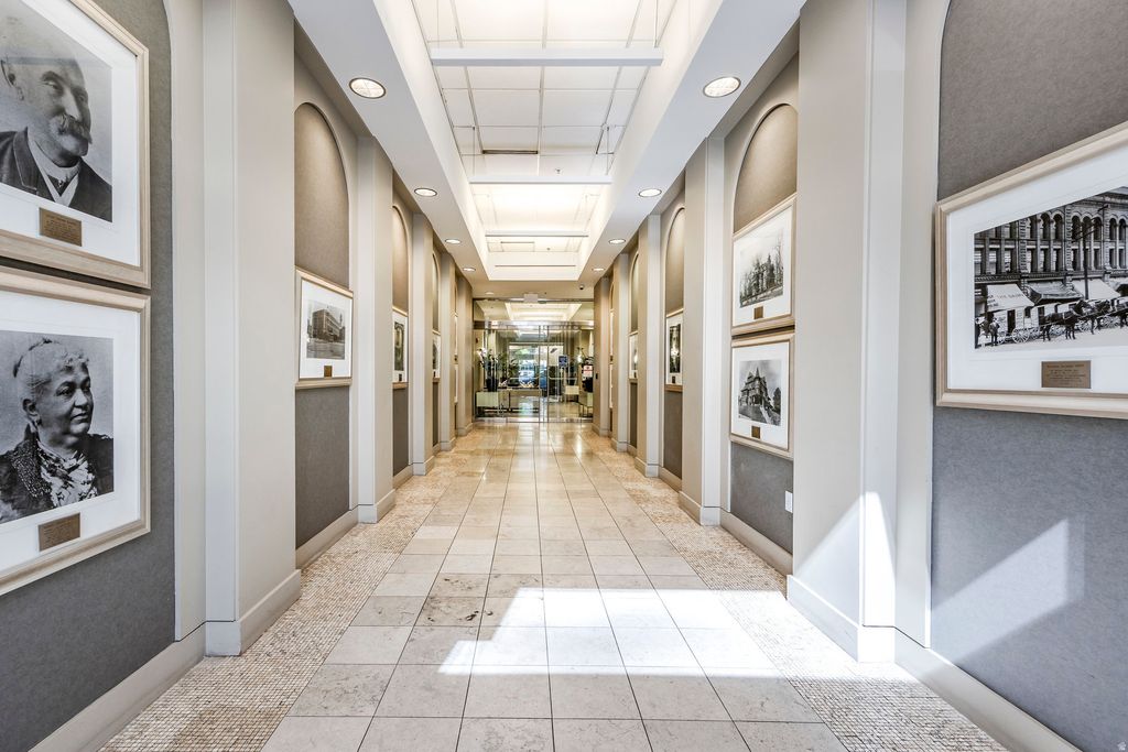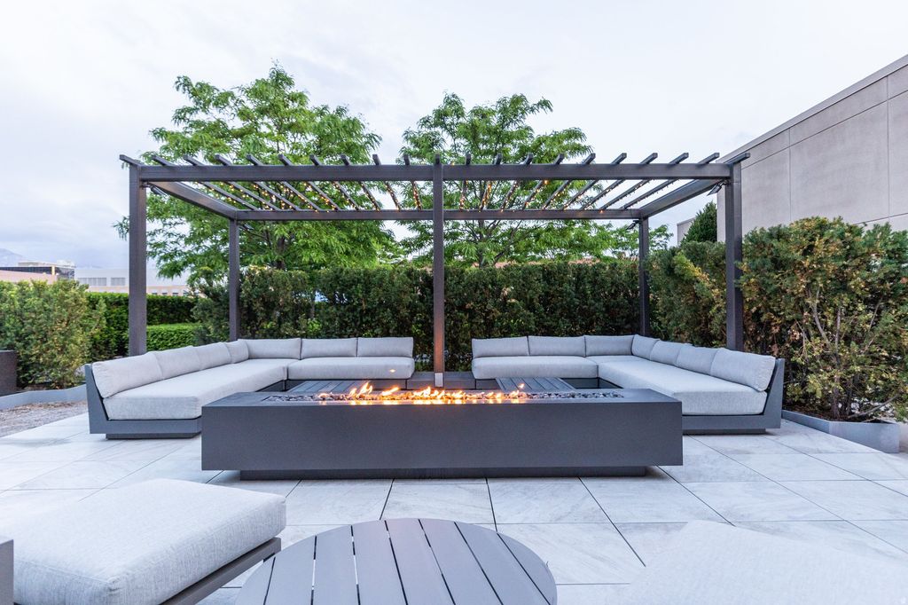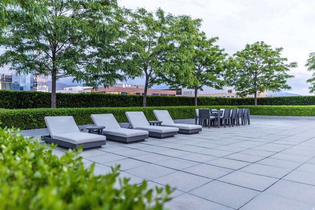 A downtown Salt Lake City rooftop oasis. As you arrive at The Plaza, on the 4th level of this bank building, you instantly feel the uniqueness of the property. Perched above the busy city streets, you are immersed in an incredible park-like space full of mature trees, English row style hedges, patios, a fire pit wrapped with RH lounge furniture, and inviting walkways. This townhome has recently gone through a complete renovation with only the highest quality finishes and craftsmanship, including a marble floor entry, quarter sawn white oak floors, quartzite countertops, custom cabinetry and built-ins, professional light fixtures, solid core doors, polished nickel Rowe and Waterworks fixtures, and designer paint and wall treatments. The floor plan is built around the large family room with vaulted ceilings facing the kitchen with Bosch and Wolf appliances, a huge marble island and a built-in leather banquette. Around the corner is a butler's pantry with wine and pantry storage. Upstairs, the views are even more impressive from the spacious primary suite with an ensuite walk-in closet and a luxurious principal bathroom featuring heated floors and heated mirrors on the built-in medicine cabinets on a wall covered with hand-chipped marble. Within easy walking distance to all the city has to offer, including the best restaurants and bars, the Broadway Cinema Centre, Gallivan Center, Regent Street, Eccles Theater, Capitol Theater, Abravanel Hall and a Marriott Hotel next-door for your guests. You also have two parking spots in the secured garage and easy access to the freeway, meaning you are only minutes from mountain hiking and biking, world class skiing, the Salt Lake International Airport, and much more.