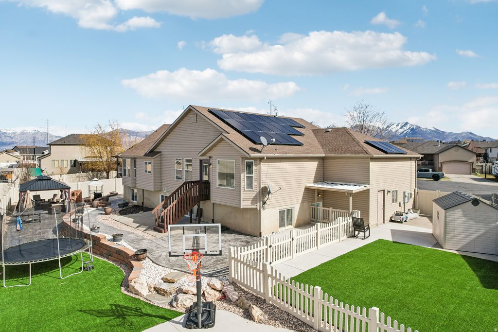 Located at the top of a quiet cul-de-sac in West Haven, this home offers a flexible layout and exceptional outdoor living. The walk-out basement has a separate entrance and is plumbed for a future kitchen, providing strong potential for multi-generational living, extended guests, or added privacy. One lower-level room is currently set up as a theater but can function as a bedroom. Vaulted ceilings and abundant natural light highlight the main level, which also includes a dedicated upstairs office. The backyard is built for recreation and entertaining with a large basketball sport court, covered pergola, turf area for pets, and extensive concrete walkways. Solar panels improve energy efficiency, with convenient access to commuter routes, shopping, and Hill Air Force Base.
