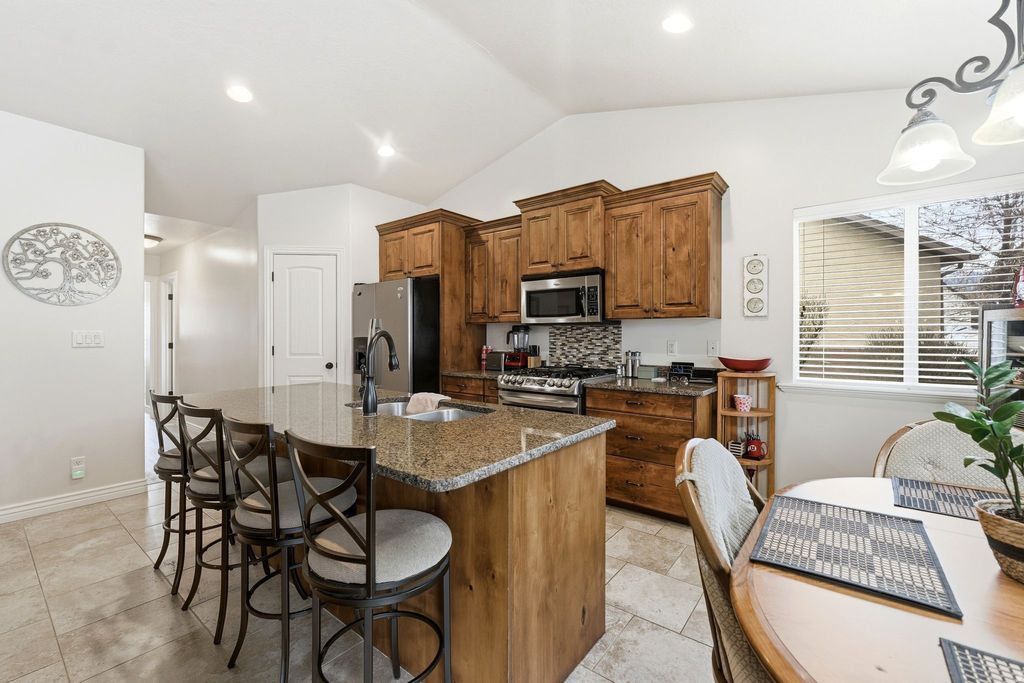 Experience all the charm Utah's hometown has to offer with this beautifully maintained rambler tucked away on a quiet cul-de-sac and just a short walk from Main Street and downtown Kaysville. Enjoy maintenance-free, main-level living in this bright and open floor plan designed for comfort and easy entertaining. Just off the main entrance, French doors lead into a designated office space. Vaulted ceilings create an open feel in the spacious family room, which flows seamlessly into the kitchen and dining area. The kitchen features staggered cabinets, granite countertops, a gas range, and stainless steel appliances. The primary suite offers trey ceilings, a ceiling fan, walk-in closet, and a separate tub and shower. Also on the main level you'll find an additional bedroom and laundry. Downstairs, a large family room with a second fireplace provides plenty of space to relax or entertain, along with two additional bedrooms, a den, cold storage, and multiple storage rooms. Complete with a two-car garage, and a covered deck out the back, this one-owner home is exceptionally clean and has been meticulously cared for.