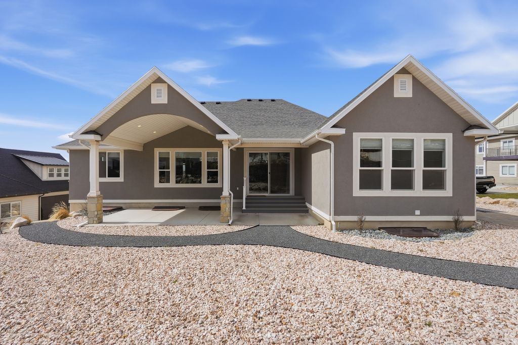 Stunning luxury rambler showcasing custom finishes and breathtaking mountain and valley views. The beautifully designed kitchen flows into a spacious great room featuring exposed beam ceilings, a striking rock gas fireplace, and expansive windows that open to a covered patio and professionally xeriscaped backyard with a fire pit gathering area-perfect for relaxing or entertaining. The main-level primary suite offers a spa-like bathroom with a soaking tub, separate shower, and walk-in closet. A versatile office or third bedroom features a stylish barn-style sliding door. The main floor also includes a guest bedroom, full bathroom, laundry room, half bath, and mudroom with built-in bench and cabinetry. The bright daylight basement offers an enormous family room, kitchen cabinets, two large bedrooms, one full and one bath, plus a walkout entrance-ideal for a future mother-in-law apartment. A large game room with a quality pool table provides the perfect space for family entertainment. Completing the home is a massive three-car garage with an additional shop or storage area. The fully xeriscaped yard ensures low maintenance and water efficiency. This home shows like new and is truly a 10+.