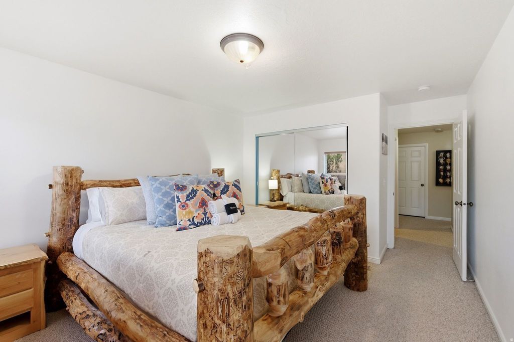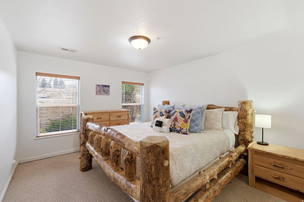 Pristine turn-key END UNIT condo located in the luxury Moose Hollow Subdivision. Spacious upgraded kitchen with granite countertops, stainless steel appliances, dining, and great room with cozy fireplace. The master bedroom has an ensuite bathroom completely remodeled from original and direct access to the beautiful main floor patio space. A year-round mountain stream offers peace and tranquility while relaxing on the back deck or patio. The condo is sold fully furnished, including housewares, and is ready as a lovely primary residence, vacation getaway, or ideal rental income source. Private storage locker included. Unobstructed views of Nordic Valley ski resort, Ben Lomond Peak, Willard Peak, and the surrounding mountains. 18 hole championship golf course across the street. The condo is situated just below Wolf Creek Resort and minutes from Powder Mountain (on the shuttle route), Snowbasin and Pineview Reservoir. Community amenities: seasonal pool, jacuzzi/hot tub, sauna, exercise room, game room at clubhouse, & volleyball courts. Ideal mountain getaway with easy access to year-round recreation.