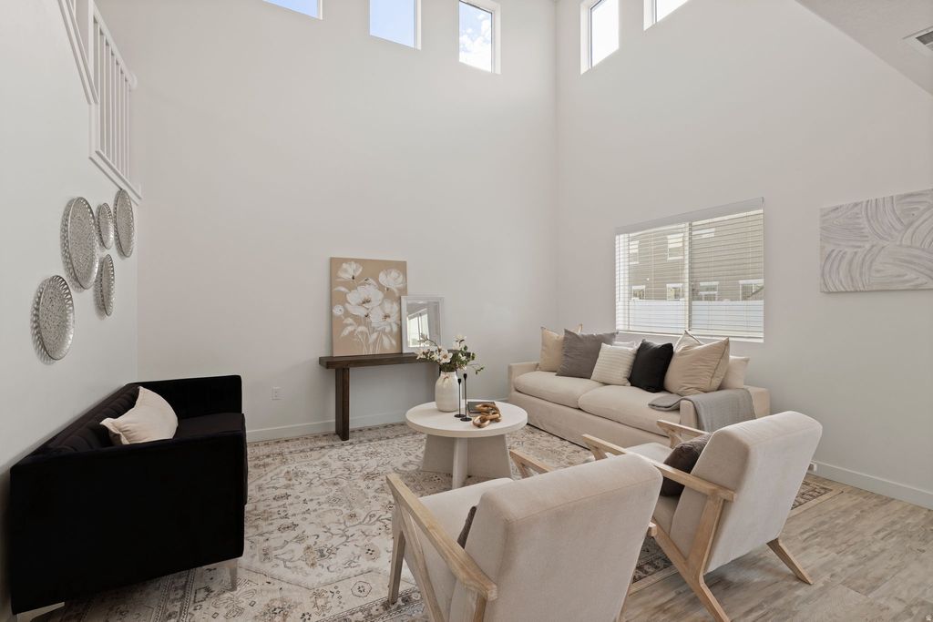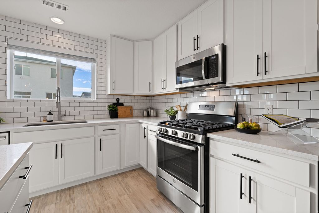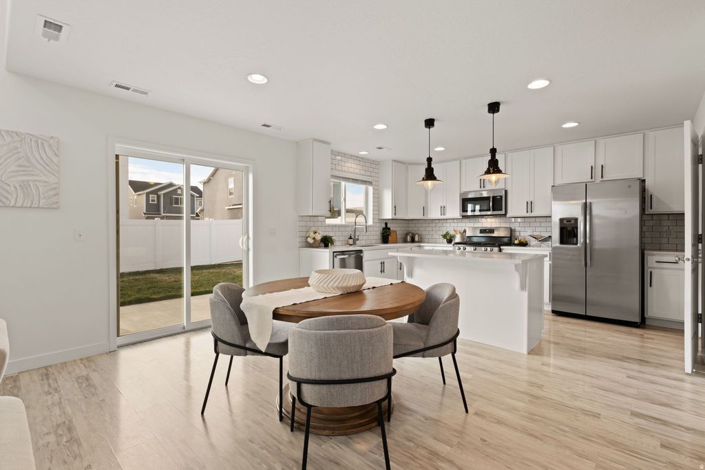 Beautifully maintained two-story home in Syracuse's desirable Stillwater community offering 3 bedrooms, 2.5 bathrooms, and an open, light-filled floorplan. The main level features a spacious living room with two-story ceilings and an open kitchen with quartz countertops, stainless steel appliances, tiled backsplash, and walk-in pantry. Upstairs you'll find a private primary suite with walk-in closet and separate tub/shower, along with convenient upstairs laundry and two additional bedrooms. Enjoy a fully fenced and landscaped backyard with patio, plus access to exceptional HOA amenities including a pool, clubhouse, fitness center, playground, and biking trails-all just minutes from parks, schools, and shopping. Move-in ready with all appliances included!