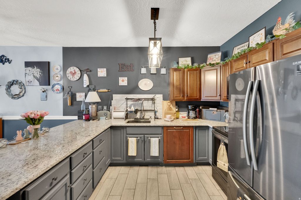 Welcome to this beautifully maintained and thoughtfully updated mid-level condo in the desirable Village at River's Edge community. This 2-bed 2-bath home features a spacious open floor plan, 9-foot ceilings and tons of natural light. In the kitchen you will find gorgeous granite countertops, stainless Steel appliances, and plenty of cabinet space. Large primary suite with walk-in coset and double vanity. New light fixtures throughout and a private balcony. This unit even comes with an extra storage room. Enjoy year-round ease and comfort with your own heated garage space. This secure, elevator-access building offers single-level living with wide hallway and no-step entry. Perfectly situated by freeway access, shopping and restaurants, this move-in ready condo offers convenient, low-maintenance living in the prime location!