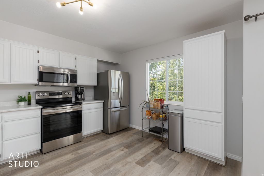 Spacious main level with an open-concept kitchen featuring white cabinetry, stainless-steel appliances, and generous counter space. A floating staircase adds a contemporary touch. The upper level offers a practical bedroom and bathroom layout, while the fully finished basement expands living space with two additional bedrooms and a full bathroom. The private back patio is shaded in the afternoons and evenings, providing a tranquil retreat to unwind after a long day. Key features: - Open-concept main level with white cabinetry and stainless appliances - Floating staircase for a modern flair - Practical and convenient upper-level bedroom/bathroom layout - Fully finished basement with two additional bedrooms and a full bathroom - Private, shaded back patio for outdoor relaxation.